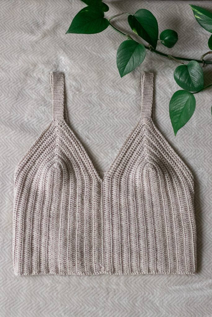 Construction: The front of this top is worked in two identical pieces that get seamed together along the center-front. After seaming these pieces together, the back panel is worked directly onto your front piece, including the back-shaping onto which your straps will attach. The straps are worked last.